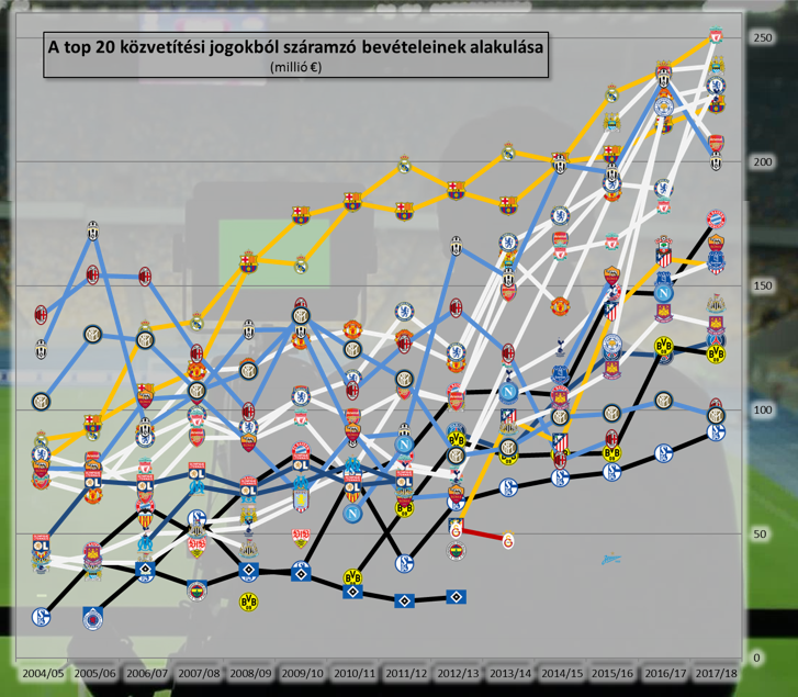 A Deloitte legújabb listáján is érezhető, hogy az UEFA 2017/18-ban megnövekvő díjazásaival és azok szétosztásának még a korábbinál is elitistább átszervezésével megnövekedett a BL-szereplés súlya a leggazdagabb csapatok költségvetésében is (az azzal járó marketingértékről nem is beszélve). A legjelentősebb bevételeket regisztráló klubok rangsorában ugyanis két év után elveszítette vezető pozícióját a nyolcaddöntőben elvérző Manchester United (a tavalyi eredményhez képest -2% bevétel), de az európai húsosfazékról a legrosszabb pillanatban lemaradó Arsenal (-10%) is három helyet zuhant vissza. Az ágyúsokat a döntős Liverpool (+21%) alaposan meg is előzte, az elődöntőig menetelő AS Roma (+46%) pedig az UEFA-tól kapott 83,8 millió eurónak köszönhetően kilenc helyet lépet feljebb és ismét a top 20-ban találta magát, akárcsak az EL market pooljából gyarapodó Milan (+8%), miközben a korai kiesést megsínylő Napoli (-9%) kipottyant onnan, és a Dortmund (-5%) mérlegére sem volt jó hatással a BL-csoportkörben való búcsú. Mindeközben a tavalyi címvédéssel 88,7 millió eurót kaszírozó Real Madrid (+11%) ugrott újra a Deloitte listájának az élére, hiszen a királyiak először lépték át az évi 700 milliós bevételi határt, mégpedig nem is kis szökkenéssel.